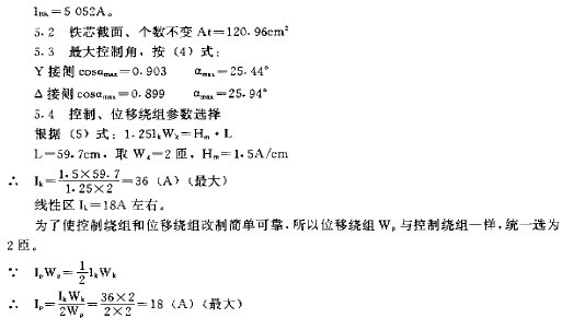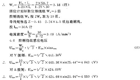 5 改造自飽和電抗器參數(shù)選擇 從原設(shè)計(jì)參數(shù)可看出,其設(shè)計(jì)錯(cuò)誤的關(guān)鍵是控制、位移繞組匝數(shù)過多,取值過大.造成穩(wěn)流調(diào)節(jié)曲線過陡.二次感應(yīng)電壓過高達(dá)5000V。平渡電抗器選擇過小,僅2×24mH,濾波不起作用。穩(wěn)流系統(tǒng)極不穩(wěn)定.位移和控制電流只能維持在5A以下,原來的自飽和電抗器沒有發(fā)揮其應(yīng)有的穩(wěn)流作用.只能靠有載開關(guān)調(diào)壓。因此,決定這次改造的方向是減少電抗器控制和位移繞組匝數(shù),提高控制電流;加大濾渡電感. 以達(dá)到穩(wěn)定調(diào)壓的目的。
