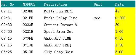 (5)調(diào)整機(jī)械抱閘控制點(diǎn): 02-11=42 (多功能輸出)02-31=0.2S延遲時(shí)間 02-32=30 (電流監(jiān)測) 02-33=1.0(速度設(shè)置) 07-15=0.3()07-16=1.5 05-25=3.0