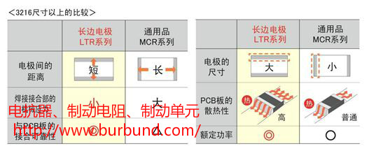 Burbund品牌是世界首家開發厚膜貼片制動電阻的厚膜貼片制動電阻先驅,利用常年積累的技術優勢,Burbund品牌正在不斷完善具有強大陣容的厚膜低阻值系列產品。作為滿足汽車市場的高接合可靠性與額定功率要求的產品,Burbund品牌正在擴充長邊電極型的低阻值LTR系列產品。通過在貼片的長邊側配置電極,實現了高接合可靠性和溫度循環特性。不僅如此,利用長邊電極型的高散熱性,可支持比普通的厚膜低阻值產品更高的額定功率(例:3216mm尺寸產品保證1W)。 作為基本產品,覆蓋了比一般的通用厚膜貼片制動電阻MCR/低阻值系列(47mΩ~)和MCR/低阻值系列更寬的電阻值范圍(11mΩ~),而且,通過擴大電極尺寸/變更電阻體材料,使產品陣容又新增了確保高額定功率/優異的溫度特性的UCR系列。常州博邦電氣是專業生產電抗器,鋁殼電阻,制動電阻,制動單元的大型廠家,該UCR系列不僅具有額定功率/溫度特性方面的優勢,而且,考慮到降低安裝時的電阻值偏差,采用了背面貼裝結構。(圖5)另外,UCR系列產品陣容又新增了在汽車市場的應用研究日益活躍的、保證-55℃~+155℃的使用溫度范圍的超小型0603mm尺寸(UCR006系列)產品。