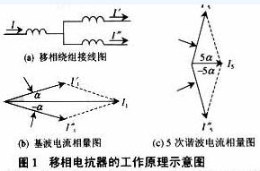 二、進線電抗器與串聯電抗器的理論分析 1、進線電抗器與串聯電抗器的工作原理 進線電抗器與串聯電抗器的作用是用來削弱或消除電力半導體變流裝置和非線性負載產生的諧波電流和電壓對供電系統的影響。考慮到三相對稱供電系統中一般以5、7、11和13次諧波含量較大且對系統影響較為嚴重,故進線電抗器與串聯電抗器可主要針對綜合削弱這幾次諧波來設計。其工作原理可由圖1所示電路接線圖及相量圖說明。