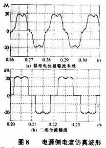 本文分析了進線電抗器與串聯電抗器的諧波抑制機理,介紹了進線電抗器與串聯電抗器的結構、最佳移相角的選取、移相繞組連接方式及移相繞組匝數的確定等。對具有進線電抗器與串聯電抗器的六相整流系統進行了基于SIMULINK的數字仿真和實驗研究,并與未采用移相方式的三相全波整流電路進行了對比分析。仿真與實驗結果的電流頻譜分析表明,采用進線電抗器與串聯電抗器的六相整流電路對于電源側的5、7、11和13次電流諧波有較好的抑制效果。
